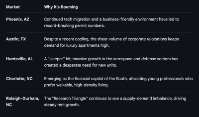 While traditional hubs like New York and San Francisco remain staples, the real explosive growth is happening in “secondary” markets where jobs are migrating and land is still available.